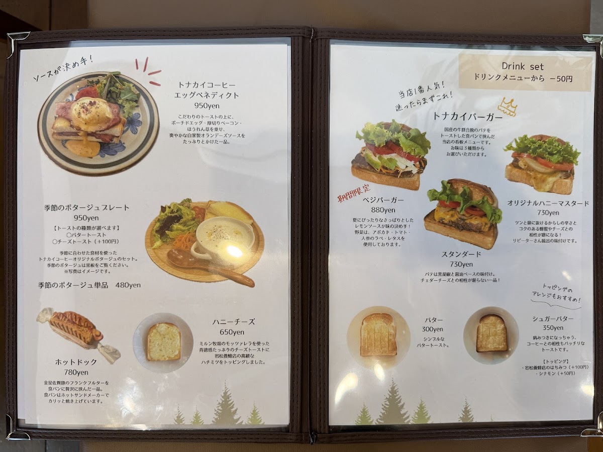 The menu at Tonakai Coffee is a celebration of flavors, centering around both traditional and innovative items. Start your dining journey with their トナカイバーガー (Tonakai Burger), a star of the show that boasts a juicy 100g patty paired with your choice of sauce—try the original honey mustard for a sweet twist! The bun is soft yet sturdy, beautifully soaked with the richness of the meat and the freshness of the crisp lettuce and tomato. Customers rave about its hearty and satisfying nature, making every bite a joyful experience.